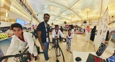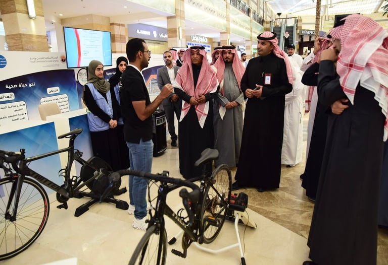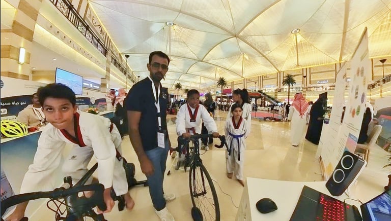 The Jubail Rider Interactive Booth is held as part of national, sports, and social events. It offers visitors a realistic cycling experience using an interactive indoor trainer connected to the Zwift app, allowing them to enjoy the atmosphere of cycling in a fun and safe way.